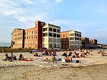 The beaches at Jacob Riis Park consists of 14 bays numbered east-to-west on the Atlantic coast.[4]:6 (PDF p.12)[165][166] The main beach occupies the western half of the park, or Bays 6 through 14, at the mouth of the Central Mall. Bays 1 through 5 lie on the eastern half in front of Neponsit Beach Hospital and the park bathhouse. Bay 1 is directly in front of the hospital, while the bathhouse feeds into Bay 4.[96][78][14][165] The main beach features a distinctive crescent shape opening towards the Atlantic Ocean.[12]:7·3 The eastern half of the beach is much more narrow than the western half.[14] Each bay is separated by reinforced concrete jetties, boulders, and rows of wooden pilings which extend into the ocean.[14] The jetties also stabilize the sand of the beach.[12]:7·3 Until the 1950s, Bays 1 and 2 were part of the Neponsit Hospital property.[78] Adjacent to the east of Bay 1 is Rockaway Beach, another public beach which stretches from Neponsit to Far Rockaway at the east end of the peninsula.[147]:12–13 A fence separates the two beaches.[111]