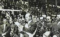 Prior to his death, Arana had planned to run in the 1950 presidential elections. His death left Árbenz without any serious opposition in the elections (leading some, including the CIA and US military intelligence, to speculate that Árbenz personally had him eliminated for this reason).[51] Árbenz had only a couple of significant challengers in the election, in a field of ten candidates.[49] One of these was Jorge García Granados, supported by some members of the upper-middle class who felt the revolution had gone too far. Another was Miguel Ydígoras Fuentes, who had been a general under Ubico and had the support of the hardline opponents of the revolution. During his campaign, Árbenz promised to continue and expand the reforms begun under Arévalo.[52] Árbenz was expected to win the election comfortably because he had the support of both major political parties of the country, as well as that of the labor unions, which campaigned heavily on his behalf.[53] In addition to political support, Árbenz had great personal appeal. He was described as having "an engaging personality and a vibrant voice".[54] Árbenz's wife María also campaigned with him; despite her wealthy upbringing she had made an effort to speak for the interests of the Mayan peasantry and had become a national figure in her own right. Árbenz's two daughters also occasionally made public appearances with him.[55]