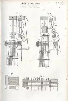 The first prototype of a Jacquard-type loom was made in the second half of the 15th century by an Italian weaver from Calabria, known as Jean le Calabrais, who was invited to Lyon by Louis XI.[8] He introduced a new kind of machine which was able to work the yarns faster and more precisely. Over the years, improvements to the loom were ongoing.[9]