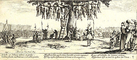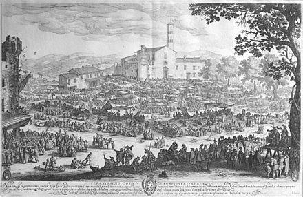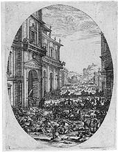 Jacques Callot (French: [ʒak kalo]; c. 1592 – 1635) was a baroque printmaker and draftsman from the Duchy of Lorraine[1] (an independent state on the north-eastern border of France, southwestern border of Germany and overlapping the southern Netherlands). He is an important person in the development of the old master print. He made more than 1,400 etchings that chronicled the life of his period, featuring soldiers, clowns, drunkards, Gypsies, beggars, as well as court life. He also etched many religious and military images, and many prints featured extensive landscapes in their background.