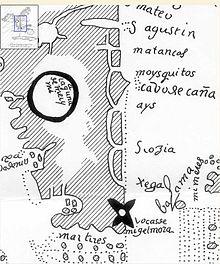 The displayed partial map is titled Planta de la costa de la Florida'y en que paraje La Laguna de Ma'ymi'y adonde se ha de hacer un fuerte (Map of the coast of La Florida and in which spot the Lake of Maimi and to where we have to make a fort) dated circa 1600. The original is in the Archives of the Indies in Sevilla, Spain, identified as Maps de Mexico y Florida from the collection of Pedro Torre Lanzas, cartographer unknown. A reproduction is held by the Library of Congress.[10] It shows the relative locations of Saint Augustine (S Agustin), Cape Canaveral (Cabo de Cañabezal), as well as the approximate territories of the Ays (Ais) and Xega tribes.