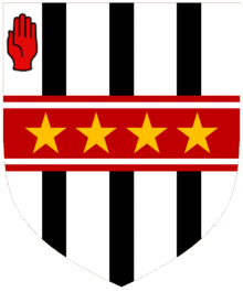 Argent three Pallets Sable on a Fess cotised Gules four Mullets Or [1]