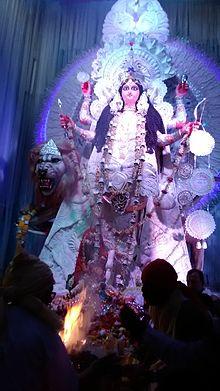 Jagatdhatri or Jagaddhatri (Bengali: জগদ্ধাত্রী, Devanagri: जगद्धात्री, Odia: ଜଗଦ୍ଧାତ୍ରୀ, 'Bearer of the World') is an aspect of the Hindu goddess Parvati, who is particularly worshipped in the Indian states of West Bengal and Odisha. Her worship and rituals are directly derived from Tantra where she is a symbol of sattva beside Durga and Kali, respectably symbolized with Rajas and Tamas.