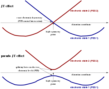 While recognizing the JTE distortion as a concrete example of the general spontaneous symmetry breaking mechanism, the exact degeneracy of the involved electronic state was identified as a non-essential ingredient for this symmetry breaking in polyatomic systems. Even systems that in the undistorted symmetric configuration present electronic states which are near in energy but not precisely degenerate, can show a similar tendency to distort. The distortions of these systems can be treated within the related theory of the pseudo Jahn–Teller effect (in the literature often referred to as "second-order JTE"). This mechanism is associated to the vibronic couplings between adiabatic PES separated by nonzero energy gaps across the configuration space: its inclusion extends the applicability of JT-related models to symmetry breaking in a far broader range of molecular and solid-state systems.