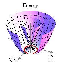 The conical shape near the degeneracy at the origin makes it immediately clear that this point cannot be stationary, that is, the system is unstable against asymmetric distortions, which leads to a symmetry lowering. In this particular case there are infinitely many isoenergetic JT distortions. The giving these distortions are arranged in a circle, as shown by the red curve in the figure. Quadratic coupling or cubic elastic terms lead to a warping along this "minimum energy path", replacing this infinite manifold by three equivalent potential minima and three equivalent saddle points. In other JT systems, linear coupling results in discrete minima.