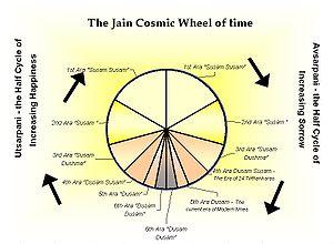 - Kāla or Time – Time is a real entity according to Jainism and all activities, changes or modifications are achieved only in time. Time is like a wheel with twelve spokes divided into descending and ascending: half with six stages of immense durations, each estimated at billions of "ocean years" (sagaropama).[8] In each descending stage, sorrow increases and at each ascending stage, happiness and bliss increase.