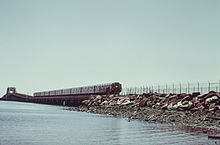 The plans were revived by 1927. At the time, the docklands were expected to gain a connection to the Long Island Rail Road.[16] Planners wanted to create a spur of the Bay Ridge Branch south to Flatlands, with two branches to Canarsie and Mill Basin.[17] A connection to Staten Island would be built via the planned Staten Island Tunnel, which would in turn allow freight to be delivered and shipped to the rest of the continental United States.[13] By 1928, the Barren Island Airport was being constructed on the bay's west shore, and advocates for the seaport project were pushing the city to construct the docklands simultaneously.[18] The Port Authority of New York and New Jersey offered to build the new railroad link for $2 million and lease it to the city.[19] In 1930, the city approved of a report recommending the acquisition of a right-of-way for a proposed LIRR branch to Paerdegat Basin. The railroad would connect to the New York Connecting Railroad, which would then connect to the national railroad system at large. Dredging Paerdegat Basin was a key part of the plan, as it would allow easier access for ships headed to Canarsie. As part of the updated proposal, two artificial islands for shipping operations would be built in Jamaica Bay.[20]