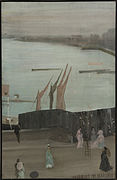 In 1866, Whistler decided to visit Valparaíso, Chile, a journey that has puzzled scholars, although Whistler stated that he did it for political reasons. Chile was at war with Spain and perhaps Whistler thought it a heroic struggle of a small nation against a larger one, but no evidence supports that theory.[41] What the journey did produce was Whistler's first three nocturnal paintings—which he termed "moonlights" and later re-titled as "nocturnes"—night scenes of the harbor painted with a blue or light green palette. After he returned to London, he painted several more nocturnes over the next ten years, many of the River Thames and of Cremorne Gardens, a pleasure park famous for its frequent fireworks displays, which presented a novel challenge to paint. In his maritime nocturnes, Whistler used highly thinned paint as a ground with lightly flicked color to suggest ships, lights, and shore line.[42] Some of the Thames paintings also show compositional and thematic similarities with the Japanese prints of Hiroshige.[43]
