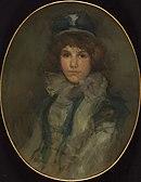 In 1847–1848, his family spent some time in London with relatives, while his father stayed in Russia. Whistler's brother-in-law Francis Haden, a physician who was also an artist, spurred his interest in art and photography. Haden took Whistler to visit collectors and to lectures, and gave him a watercolour set with instruction. Whistler already was imagining an art career. He began to collect books on art and he studied other artists' techniques. When his portrait was painted by Sir William Boxall in 1848, the young Whistler exclaimed that the portrait was "very much like me and a very fine picture. Mr. Boxall is a beautiful colourist... It is a beautiful creamy surface, and looks so rich."[16] In his blossoming enthusiasm for art, at fifteen, he informed his father by letter of his future direction, "I hope, dear father, you will not object to my choice."[17] His father, however, died from cholera at the age of 49, and the Whistler family moved back to his mother's home town of Pomfret, Connecticut. His art plans remained vague and his future uncertain. The family lived frugally and managed to get by on a limited income. His cousin reported that Whistler at that time was "slight, with a pensive, delicate face, shaded by soft brown curls... he had a somewhat foreign appearance and manner, which, aided by natural abilities, made him very charming, even at that age."[18]