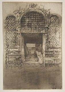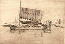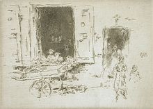 After the trial, Whistler received a commission to do twelve etchings in Venice. He eagerly accepted the assignment, and arrived in the city with girlfriend Maud, taking rooms in a dilapidated palazzo they shared with other artists, including John Singer Sargent.[85] Although homesick for London, he adapted to Venice and set about discovering its character. He did his best to distract himself from the gloom of his financial affairs and the pending sale of all his goods at Sotheby's. He was a regular guest at parties at the American consulate, and with his usual wit, enchanted the guests with verbal flourishes such as "the artist's only positive virtue is idleness—and there are so few who are gifted at it."[86]