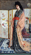 Two years later, Whistler painted another portrait of Hiffernan in white, this time displaying his newfound interest in Asian motifs, which he entitled The Little White Girl. His Lady of the Land Lijsen and The Golden Screen, both completed in 1864, again portray his mistress, in even more emphatic Asian dress and surroundings.[39] During this period Whistler became close to Gustave Courbet, the early leader of the French realist school, but when Hiffernan modeled in the nude for Courbet, Whistler became enraged and his relationship with Hiffernan began to fall apart.[40] In January 1864, Whistler's very religious and very proper mother arrived in London, upsetting her son's bohemian existence and temporarily exacerbating family tensions. As he wrote to Henri Fantin-Latour, "General upheaval!! I had to empty my house and purify it from cellar to eaves." He also immediately moved Hiffernan to another location.[41]