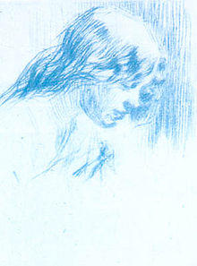 The etchings include portraits of family, mistresses, and intimate street scenes in London and Venice.[65] Whistler gained an enormous reputation as an etcher. Martin Hardie wrote "there are some who set him beside Rembrandt, perhaps above Rembrandt, as the greatest master of all time. Personally, I prefer to regard them as the Jupiter and Venus, largest and brightest among the planets in the etcher's heaven."[66] He took great care over the printing of his etchings and the choice of paper. At the beginning and end of his career, he placed great emphasis on cleanness of line, though in a middle period he experimented more with inking and the use of surface tone.[67]