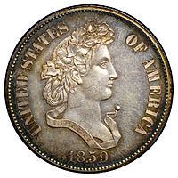 In 1853, Congress authorized a three-dollar piece. In a note found among his papers, Longacre wrote that his task was to make the coin as easy as possible to distinguish from the quarter eagle, which at $2.50 was close in value. Longacre produced a design for a Native American princess, which he made different from Gobrecht's Liberty design on the quarter eagle with a thinner and wider planchet.[34] At the time, a female Native American was often used to represent America in art, and a depiction of Liberty as an Indian princess was in accord with contemporary practices.[35] The chief engraver wrote to Mint Director Snowden that the three-dollar piece, which went into production in 1854, was the first time he had been allowed artistic freedom in designing a coin.[36] The gold dollar was altered the same year to make the planchet both thinner and wider; Longacre modified his princess design for the gold dollar.[34] For the reverse of the coins, Longacre created a wreath of wheat, corn, tobacco, and cotton, blending the agricultural products of the North and the South. This wreath would also be used on the reverse of the Flying Eagle cent in 1856;[32] reused on the dime beginning in 1860, the "cereal wreath" would be Longacre's last surviving design on coinage, remaining with modifications until the 1916 abandonment of the Barber dime.[37][38]