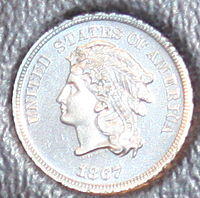 Nickel had been removed from the cent over the objection of Pennsylvania industrialist Joseph Wharton, who had large interests in the metal; his congressman, Thaddeus Stevens, had fought against the act.[54] In 1864, Wharton published a pamphlet arguing for a coinage in which all coins less than ten cents would be made of a copper-nickel alloy with 25% nickel, just over twice the percentage which the cent had contained.[55] In March 1865, Congress passed legislation for a three-cent coin of that alloy, intended to retire fractional currency of that denomination. Longacre furnished a head of Liberty for the coin resembling his other depictions of the goddess which he had made in the past 16 years; for the reverse he used the "laurel" wreath from the 1859 cent surrounding the Roman numeral III borrowed from the silver three-cent piece.[56]