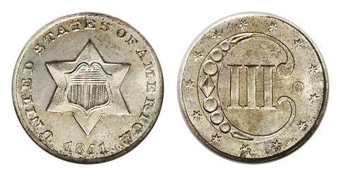 - Three-cent piece in silver (1851–1873) and nickel (1865–1889)