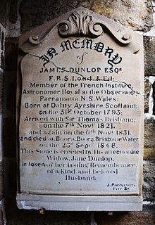 James Dunlop FRSE (31 October 1793 – 22 September 1848) was a Scottish astronomer, noted for his work in Australia. He served as astronomer's assistant who was hired by Sir Thomas Brisbane to work at his private observatory, once located at Paramatta (now named Parramatta), New South Wales, about 23 kilometres (14 mi) west of Sydney during the 1820s and 1830s. Dunlop was mostly a visual observer, doing stellar astrometry work for Brisbane, and after its completion, then independently discovered and catalogued many new telescopic southern double stars and deep-sky objects. He later became the Superintendent of Paramatta Observatory when it was finally sold to the New South Wales Government.