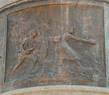 Kelly's first major commission was for the 1884 Monmouth Battle Monument – five bronze relief panels depicting scenes from the battle. He had a difficult time finding models who did not have mustaches or beards – then being worn by most men of that era – so he prevailed upon a friend from nearby Menlo Park, New Jersey, to pose for him. Because of that, a portrait of the 30-year-old Thomas Alva Edison can be found on the monument as Molly Pitcher's wounded husband.[4]