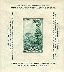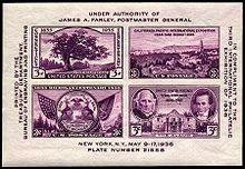 Farley is remembered among stamp collectors for two things. One is a series of souvenir sheets that were issued at commemorative events and bore his name as the authorizer. The other is the 20 stamps, known as "Farley's Follies," which were preprints, mostly imperforated and ungummed, of stamps of the period: Farley bought them at face value, out of his own pocket, and gave them to Roosevelt and Interior Secretary Harold Ickes, both collectors, and to members of his family and special friends of the Administration. (Farley himself did not collect stamps.) Unfortunately, some of them reached the market, offered at the high prices commanded by rarities. When ordinary stamp collectors learned of that, they lodged strenuous protests, newspaper editorials leveled charges of corruption and a heated Congressional investigation ensued. Finally, in 1935 many more stamps of the unfinished stamps were produced and made generally available to collectors at their face value.[11]