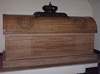 James died in Rome on 1 January 1766, in his home the Palazzo Muti,[2] and was buried in the crypt of St. Peter's Basilica in the Vatican City. His burial is marked by the Monument to the Royal Stuarts. His claimed reign had lasted for 64 years, 3 months and 16 days, longer than any legitimate British monarch until Queen Elizabeth II's reign surpassed it on 23 May 2016.[12]