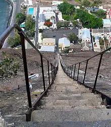 The town has over 100 listed buildings,[10] mostly from the Georgian era. Main Street has been described as "one of the best examples of unspoilt Georgian architecture anywhere in the world."[11] Many buildings are built out of local volcanic rock. St James' Church dates from 1772 and is the oldest Anglican church in the Southern Hemisphere.[12] Another of the town's prominent features is Jacob's Ladder, a staircase of 699 steps, built in 1829 to connect Jamestown to the former fort on Ladder Hill. The ladder is very popular with tourists, is lit at night and a timed run takes place there every year, with people coming from all over the world to take part.[13] The Museum of Saint Helena is situated in Jamestown, one of two museums on the island (the other being Longwood House).[7]