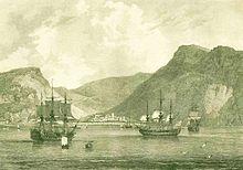 After his defeat in the Battle of Waterloo in June 1815 and the subsequent occupation of Paris, the Emperor of the French, Napoleon, surrendered to the British and was exiled to St Helena. He arrived on 21 October aboard the 74-gun ship HMS Bellerophon and resided at the Briars in Jamestown for several months until he was transferred to Longwood House in a more remote part of the island in December.[4] Jamestown was chosen to host a vice admiralty court and a naval base for British efforts to interdict the slave traffic between Africa and the Americas. Captured slave ships were often brought to Jamestown to be sold and their cargos were off-loaded in Rupert's Valley. By the time that the naval station was closed in the 1870s, an estimated 25,000 slaves had been rescued, although about 5,000 died shortly after arrival and were buried in Rupert's Valley. Long lost, their graves were rediscovered in 2006 in conjunction with preliminary digging for the airport. A team of archaeologists arrived in mid-2008 to excavate the graves. Some of the finds from the excavations are on exhibit at the International Slavery Museum in Liverpool, England.[5]