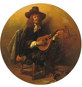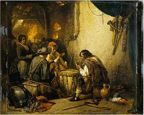 Many of the paintings from this period depict specific historical subjects, while others were genre scenes or portraits. This development towards Realism made him one of the pioneers of this artistic movement in Belgium.[3] The painting ’'Wedding in Flanders in the 17th century (1839; Royal Museum of Fine Arts Antwerp) was the first to herald this more sober style. His works from the 1640s attest to Leys' search for historical and psychological truthfulness, which replaced the emphasis on pathos and sentimental anecdote of his earlier work.[3] An example of his works that abandoned historical legend in favour of a realistic depiction of historical events is the composition Albrecht Dürer visiting Antwerp in 1520. Leys based this picture on the account given by Dürer in his own journal of the event.[10] In his scenes of 16th and 17th-century Antwerp, Leys sought to reflect the spirit and atmosphere of that time. His compositions of historical events and of everyday life were realistic and may have been inspired by contemporary French Realists Gustave Courbet and Jean-François Millet.