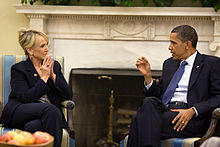 On June 3, 2010, Brewer met with President Barack Obama to discuss immigration along Mexico's border with Arizona, and how the federal government could work together with state officials to combat violence there. Brewer remarked after the meeting, "I am encouraged that there is going to be much better dialogue between the federal government and the state of Arizona now."[16] According to press reports, about 1200 national guard troops would be stationed along the border.[17]