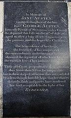 Austen made light of her condition, describing it as "bile" and rheumatism. As her illness progressed, she experienced difficulty walking and lacked energy; by mid-April she was confined to bed. In May, Cassandra and Henry brought her to Winchester for treatment, by which time she suffered agonising pain and welcomed death.[125] Austen died in Winchester on 18 July 1817 at the age of 41. Henry, through his clerical connections, arranged for his sister to be buried in the north aisle of the nave of Winchester Cathedral. The epitaph composed by her brother James praises Austen's personal qualities, expresses hope for her salvation and mentions the "extraordinary endowments of her mind", but does not explicitly mention her achievements as a writer.[128]