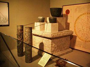 Jang's invention of the water clock saw its infusion throughout the country, however, these were very costly. Development of the sundial provided a cheaper and more manageable alternative. Jang, Ichun, Kimjo, and other scientists made Korea's first sundial, the Angbu-ilgu (앙부일구/仰釜日晷),[21] which meant "pot-shaped sun clock staring at the sky".[22] Angbu-ilgu was bronze in composition, and consisted of a bowl marked with 13 meters to indicate time and 4 legs jointed by a cross at the base.[22] Seven lines crossed the 13 meters in different curves to compensate for the seasonal changes of the course of the sun.[22] Angbu-ilgu and other variants, such as the Hyeonju Ilgu (현주일구/懸珠日晷) and the Cheonpyeong Ilgu (천평일구/天平日晷), were implemented in strategic spots, such as the town's main streets with heavy traffic, so that the people could be well informed of the time. To compensate for the high illiteracy rate among the commoners, 12 shapes of the Chinese zodiac were engraved in juxtaposition with the meters.[22] No sundials from the Joseon Dynasty made during King Sejong's reign still exist today; none are known to have survived past the Japanese invasions of Korea (1592–1598) (임진왜란).