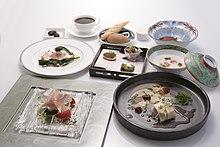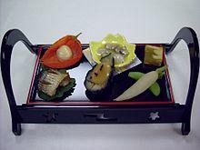 The kaiseki (懐石, lit. "warming stone") is tied with the Japanese tea ceremony.[6] The kaiseki is considered a (simplified) form of honzen-ryōri (本膳料理, lit. "main tray cooking"),[7] which was formal banquet dining where several trays of food was served.[8] There is also the homophone kaiseki ryōri (会席料理, lit. "gathering+seating"). The kaiseki referred to a gathering of composers of haiku or renga, and the simplified version of the honzen dishes served at the poem parties became kaiseki ryōri.[9] However, the meaning of kaiseki ryōri degenerated to become just another term for a sumptuous carousing banquet, or shuen (酒宴).[10]
