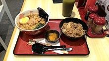 The small rice bowl or chawan (lit. "tea bowl") doubles as a word for the large tea bowls in tea ceremonies. Thus in common speech, the drinking cup is referred to as yunomi-jawan or yunomi for the purpose of distinction. Among the nobility, each course of a full-course Japanese meal would be brought on serving napkins called zen (膳), which were originally platformed trays or small dining tables. In the modern age, faldstool trays or stackup-type legged trays may still be seen used in zashiki, i.e. tatami-mat rooms, for large banquets or at a ryokan type inn. Some restaurants might use the suffix -zen (膳) as a more sophisticated though dated synonym to the more familiar teishoku (定食), since the latter basically is a term for a combo meal served at a taishū-shokudō, akin to a diner.[12] Teishoku means a meal of fixed menu (for example, grilled fish with rice and soup), a dinner à prix fixe[13] served at shokudō (食堂, "dining hall") or ryōriten (料理店, "restaurant"), which is somewhat vague (shokudō can mean a diner-type restaurant or a corporate lunch hall); writer on Japanese popular culture Ishikawa Hiroyoshi[14] defines it as fare served at teishoku dining hall (定食食堂, teishoku-shokudō), and comparable diner-like establishments.