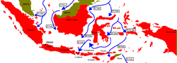 The Indonesian ruling class (composed of local officials and politicians who had formerly worked for the Dutch colonial government) co-operated with the Japanese military authorities, who in turn helped to keep the local political elites in power and employ them to supply newly arrived Japanese industrial concerns and businesses and the armed forces (chiefly auxiliary military and police units run by the Japanese military in the Dutch East Indies). Indonesian co-operation allowed the Japanese military government to focus on securing the large archipelago's waterways and skies and using its islands as defence posts against any Allied attacks (which were assumed to most likely come from Australia).[25] The Japanese colonial rulers divided Indonesia into three separate regions; Sumatra was placed under the 25th Army, Java and Madura were under the 16th Army, while Borneo and eastern Indonesia were controlled by the 2nd South Fleet of the Imperial Japanese Navy (the IJN). The 16th Army and the 25th Army were headquartered in Singapore[5] and also controlled Malaya until April 1943, when its command was narrowed to just Sumatra and the headquarters moved to Bukittinggi. The 16th Army was headquartered in Jakarta, while the IJN's 2nd South Fleet was headquartered in Makassar.