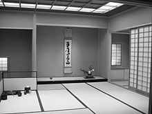 The guests arrive a little before the appointed time and enter an interior waiting room, where they store unneeded items such as coats, and put on fresh tabi socks. Ideally, the waiting room has a tatami floor and an alcove (tokonoma), in which is displayed a hanging scroll which may allude to the season, the theme of the chaji, or some other appropriate theme.