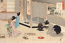 Guests may be allowed after the serving of the tea (otemae) to take a closer look at the objects in the room (Nishiki-e by Mizuno Toshikata)