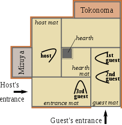Typical winter tearoom layout in a 4.5 mat tearoom, showing position of tatami, tokonoma, mizuya dōkō, hearth, guests and host