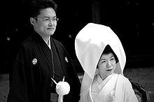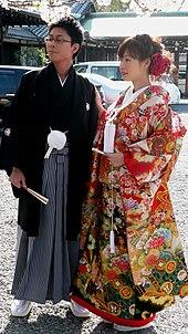 Women typically wear kimono when they attend traditional arts, such as a tea ceremonies or ikebana classes.[8] During wedding ceremonies, the bride and groom will often go through many costume changes; though the bride may start off in an entirely-white outfit before switching to a colourful one,[10] grooms will wear black kimono made from habutae silk.