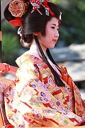 Traditional Japanese fashion represents a long-standing history of traditional culture, encompassing colour palettes developed in the Heian period, silhouettes adopted from Tang dynasty clothing and cultural traditions, motifs taken from Japanese culture, nature and traditional literature, and styles of wearing primarily fully-developed by the end of the Edo period. The most well-known form of traditional Japanese fashion is the kimono, translating literally as "something to wear" or "thing worn on the shoulders".[1] Other types of traditional fashion include the clothing of the Ainu people (known as the attus)[2] and the clothes of the Ryukyuan people (known as ryusou),[3][4] most notably including the traditional fabrics of bingata and bashōfu[2] produced on the Ryukyu Islands.