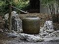 The garden was also small, and constantly watered to be damp and green. It usually had a cherry tree or elm to bring color in the spring, but otherwise did not have bright flowers or exotic plants that would distract the attention of the visitor. A path led to the entrance of the teahouse. Along the path was waiting bench for guests and a privy, and a stone water-basin near the teahouse, where the guests rinsed their hands and mouths before entering the tea room through a small, square door called nijiri-guchi, or "crawling-in entrance", which requires bending low to pass through. Sen no Rikyū decreed that the garden should be left unswept for several hours before the ceremony, so that leaves would be scattered in a natural way on the path.[23]
