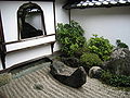 The most notable garden style invented in this period was the zen garden, or Japanese rock garden. One of the finest examples, and one of the best-known of all Japanese gardens is Ryōan-ji in Kyoto. This garden is just 9 meters wide and 24 meters long, composed of white sand carefully raked to suggest water, and fifteen rocks carefully arranged, like small islands. It is meant to be seen from a seated position on the porch of the residence the abbot of the monastery. There have been many debates about what the rocks are supposed to represent, but, as garden historian Gunter Nitschke wrote, "The garden at Ryōan-ji does not symbolize. It does not have the value of representing any natural beauty that can be found in the world, real or mythical. I consider it as an abstract composition of "natural" objects in space, a composition whose function is to incite mediation."[20]