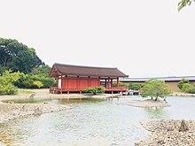 The Nara Period is named after its capital city Nara. The first authentically Japanese gardens were built in this city at the end of the eighth century. Shorelines and stone settings were naturalistic, different from the heavier, earlier continental mode of constructing pond edges. Two such gardens have been found at excavations, both of which were used for poetry-writing festivities.[8] One of these gardens, the East Palace garden at Heijo Palace, Nara, has been faithfully reconstructed using the same location and even the original garden features that had been excavated.[9][10]. It appears from the small amount of literary and archaeological evidence available that the Japanese gardens of this time were modest versions of the Imperial gardens of the Tang Dynasty, with large lakes scattered with artificial islands and artificial mountains. Pond edges were constructed with heavy rocks as embankment. While these gardens had some Buddhist and Daoist symbolism, they were meant to be pleasure gardens, and places for festivals and celebrations. Recent archaeological excavations in the ancient capital of Nara have brought to light the remains of two eighth-century gardens associated with the Imperial Court, a pond-and-stream garden—To-in—located within the precinct of the Imperial Palace and a stream garden—Kyuseki—found within the modern city. They may be modeled after Chinese gardens, but the rock formations found in the To-in would appear to have more in common with prehistoric Japanese stone monuments than with Chinese antecedents, and the natural, serpentine course of the Kyuseki stream garden may be far less formal than what existed in Tang China. Whatever their origins, both the To-in and Kyuseki clearly anticipate certain developments in later Japanese gardens.[11][12]
