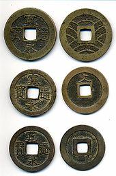 | Kan’ei Tsūhō[39][40] | 寛永通寳 | 寛永通宝 | 1626 (1 mon)[a] 1768 (4 mon) | Kan'ei 5 (1 mon) Meiwa 5 (4 mon) | 1 mon 4 mon | |