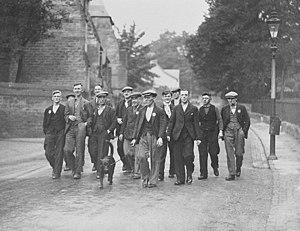 In 1921, in reaction to the rising levels of unemployment, the newly formed British Communist Party set up the National Unemployed Workers' Movement (NUWM).[11] From 1922 until the late 1930s, under its charismatic leader Wal Hannington, the NUWM organised regular marches in which unemployed workers converged on London to confront Parliament, in the belief that this would improve conditions.[12] These became known as "hunger marches", reviving a name coined by the press in 1908, when a group of London's unemployed marched to Hyde Park.[13]