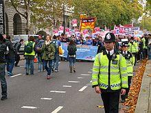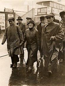 The 1922 marchers sought a meeting with the new prime minister, Bonar Law, who refused to see them because of their undemocratic leadership.[14] The march leaders were denounced in The Times as "avowed Communists ... who have been identified with disturbances in their own localities".[15] The Labour Party and the TUC kept aloof, fearful of being tainted by association with the communist organisers.[12] The same pattern was followed with subsequent NUWM marches; successive prime ministers—Stanley Baldwin in 1929, Ramsay MacDonald in 1930 and 1934—declined to meet the marchers' representatives, and the Labour Party and the TUC continued to keep their distance.[16] In 1931 MacDonald became head of a Conservative-dominated National Government that imposed a means test on unemployment benefits.[17] Anger at the means test was the rationale for the 1932 hunger march,[18] in which a series of rallies and demonstrations across London broke out into considerable violence; the leaders provoked clashes with opponents and police in Hyde Park, Trafalgar Square and Westminster which led to the arrest and imprisonment of the march's leaders.[19][20] Although women were not allowed to march on the Jarrow march, women's contingents were present at other hunger marches across the 1930s. These women, who were often the wives of unemployed men, were often faced with restrictions, such as being forced to stay in workhouses if the local Labour Party would not accommodate them.[21]