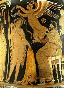 In Corinth, Jason became engaged to marry Creusa (sometimes referred to as Glauce), a daughter of the King of Corinth, to strengthen his political ties. When Medea confronted Jason about the engagement and cited all the help she had given him, he retorted that it was not she that he should thank, but Aphrodite who made Medea fall in love with him. Infuriated with Jason for breaking his vow that he would be hers forever, Medea took her revenge by presenting to Creusa a cursed dress, as a wedding gift, that stuck to her body and burned her to death as soon as she put it on. Creusa's father, Creon, burned to death with his daughter as he tried to save her. Then Medea killed the two boys that she bore to Jason, fearing that they would be murdered or enslaved as a result of their mother's actions. When Jason came to know of this, Medea was already gone; she fled to Athens in a chariot of dragons sent by her grandfather, the sun-god Helios.[5]