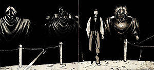 The third creature from the 3 guardians with a helmet resembling a skull, he uses the Darkness spell by striking his broadsword's blade at the ground that creates a radius of certain length. Anyone caught in it would be sent to dark dimension where they would be killed off slowly. Balez and the other creatures are in the center, which protects them from the spell. Oboro kills it by bursting out of its armor as he concealed his presence from the Darkness and its angry souls, avoiding his death.[14] The armored being was able to move on its own with Balez' sorcery.[13]