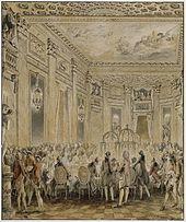 In 1770 he succeeded Charles-Nicolas Cochin as chief Dessinateur des Menus Plaisirs du Roi, on Cochin's recommendation, which occasioned his prints celebrating the marriage of the Dauphin and his coronation as Louis XVI; in 1781, in part on the strength of these productions he was appointed Dessinateur et Graveur du Cabinet du Roi, which brought an annual pension and lodgings in the galleries of the Palais du Louvre. Now he found that he required the services of other engravers to reproduce his own designs, which included illustrations for the Chansons of Jean-Benjamin de La Borde (1773), the collected works of Rousseau (1773–82) and of Voltaire (printed at Brussels, 1782–9). For the Menus Plaisirs, the office that produced and executed all the designs for settings of court festivities and recorded them in presentation drawings, he recorded many occasions such as his famous pen-and-wash record of the inauguration in September 1771 of Mme du Barry's Pavillon de Louveciennes (illustration, right). He still found time for intimate portrait drawings in charcoal and chalks[3]