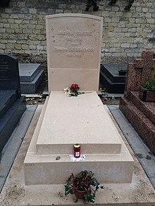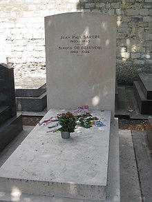 Sartre died on 15 April 1980 in Paris from edema of the lung. He had not wanted to be buried at Père-Lachaise Cemetery between his mother and stepfather, so it was arranged that he be buried at Montparnasse Cemetery. At his funeral on Saturday, 19 April, 50,000 Parisians descended onto boulevard du Montparnasse to accompany Sartre's cortege.[93][94] The funeral started at "the hospital at 2:00 p.m., then filed through the fourteenth arrondissement, past all Sartre's haunts, and entered the cemetery through the gate on the Boulevard Edgar Quinet". Sartre was initially buried in a temporary grave to the left of the cemetery gate.[95] Four days later the body was disinterred for cremation at Père-Lachaise Cemetery, and his ashes were reburied at the permanent site in Montparnasse Cemetery, to the right of the cemetery gate.[96]