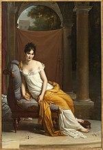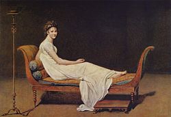 From the earliest days of the French Consulate to almost the end of the July Monarchy, Récamier's salon in Paris was one of the chief resorts of literary and political society that followed what was fashionable.[1] The habitués of her house included many former royalists, with others, such as General Jean Bernadotte and General Jean Victor Moureau, more or less disaffected to the government.[1] This circumstance, together with her refusal to act as lady-in-waiting to Empress consort Joséphine de Beauharnais and her friendship for Germaine de Staël, brought her under suspicion.[1] In 1800 Jacques-Louis David began his portrait of her, but left it unfinished on learning François Gérard had been commissioned to paint a portrait before he had.