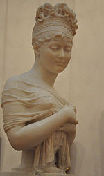 It was through Germaine de Staël that Récamier became acquainted with Benjamin Constant, a Swiss-French political activist and writer, whose political equivocations during the last days of the First French Empire and the first of the Bourbon Restoration have been attributed to her persuasions.[1] She was eventually exiled from Paris by the orders of Napoleon.[2] After a short stay at her native Lyon, she proceeded to Rome, and finally to Naples. There she was on exceedingly good terms with Joachim Murat and his wife Caroline Bonaparte, who were then intriguing with the Bourbons.[1] She persuaded Constant to plead the claims of Murat in a memorandum addressed to the Congress of Vienna, and also induced him to take up a decided attitude in opposition to Napoleon's return during the Hundred Days.[1]