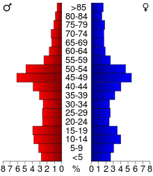 In the county, the population was spread out, with 24.40% under the age of 18, 7.60% from 18 to 24, 24.40% from 25 to 44, 29.80% from 45 to 64, and 13.80% who were 65 years of age or older. The median age was 41 years. For every 100 females, there were 95.90 males. For every 100 females age 18 and over, there were 93.60 males.